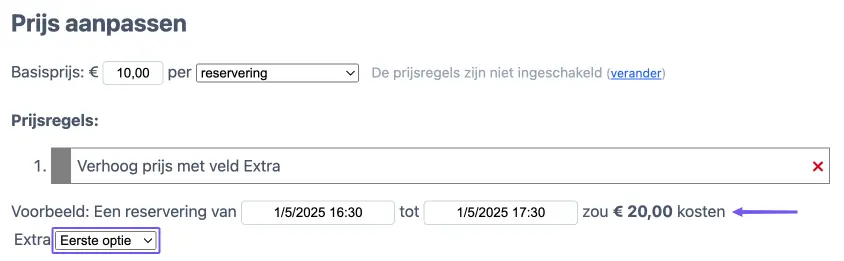 - Standaard zijn de prijsregels ingesteld op een basisprijs per reservering. Hiermee kunt u de mogelijkheid “Verhoog prijs met veld” kiezen. Deze optie voegt simpelweg de prijs die u in de dropdown-keuze hebt toegevoegd toe aan het totaalbedrag. Klik op “Wijzigingen opslaan”