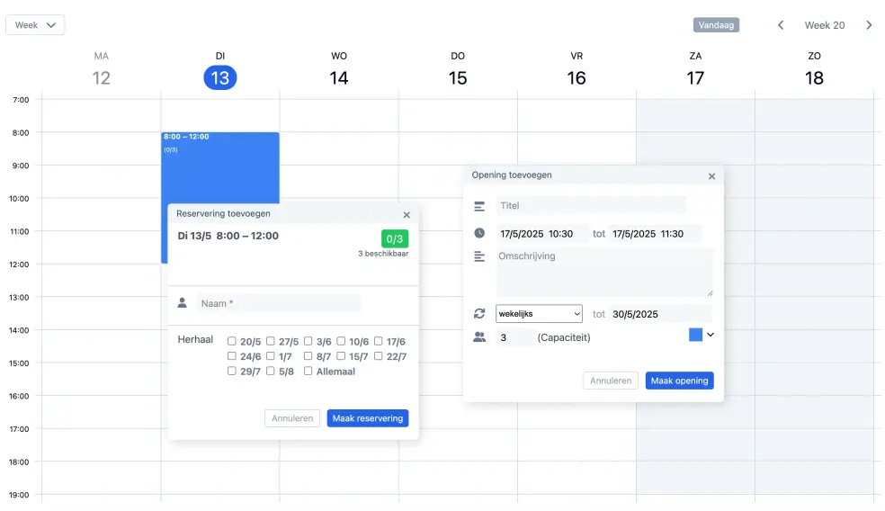 Om reserveringen meer dan 52 keer te herhalen kunnen klanten simpelweg op de laatste reservering in een serie klikken en deze opnieuw laten herhalen. Om openingen in een capaciteitsagenda vaker te laten herhalen gaat u naar de laatste opening in de serie en klikt u op “Opening wijzigen”. U ziet nu opnieuw de optie om de opening te herhalen.